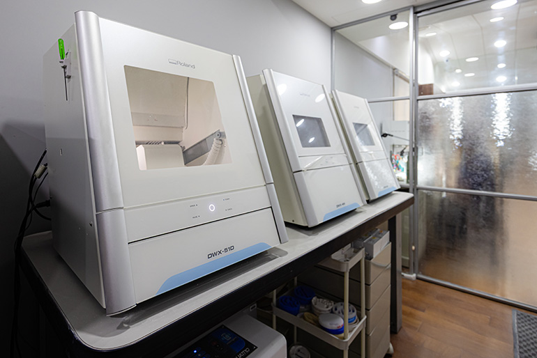 3shape口內數位掃瞄機(digital intraoral scanner),以數位印模法取代傳統印模,讓假牙的設計和製作得以數位化。不僅提高效率,也減少傳統印模法因繁複技工步驟造成的變形和誤差,大大降低印模後儲存、消毒方式、成本和材料變形的機率。